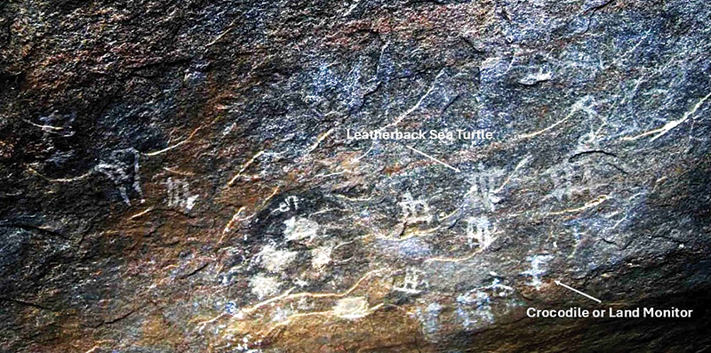 “These details suggest close observation of nature,” says Dr. Rathnayake. Archaeological evidence supports this interpretation. According to earlier studies, sea turtles were transported to Anuradhapura as early as 800 BC. During the Gedige excavations in 1985, bones of the Olive Ridley sea turtle were discovered, possibly used for ornaments or utilitarian objects. Images of land monitors and crocodiles are common in dry-zone rock art, reflecting both ecological familiarity and subsistence practices, as Veddas are known to have consumed the flesh of land monitors.
