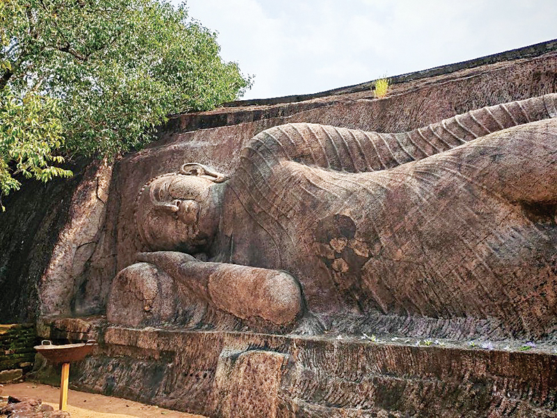 Nearby lies another monumental expression of devotion — the reclining Buddha statue, measuring approximately 45 feet in length. Unlike the Samadhi statue, this figure has been detached from the living rock and is dated to the late Anuradhapura period. Its scale and proportions closely resemble Polonnaruwa sculpture, reinforcing the idea of a continuous artistic and religious tradition that transcended shifting capitals and dynasties.