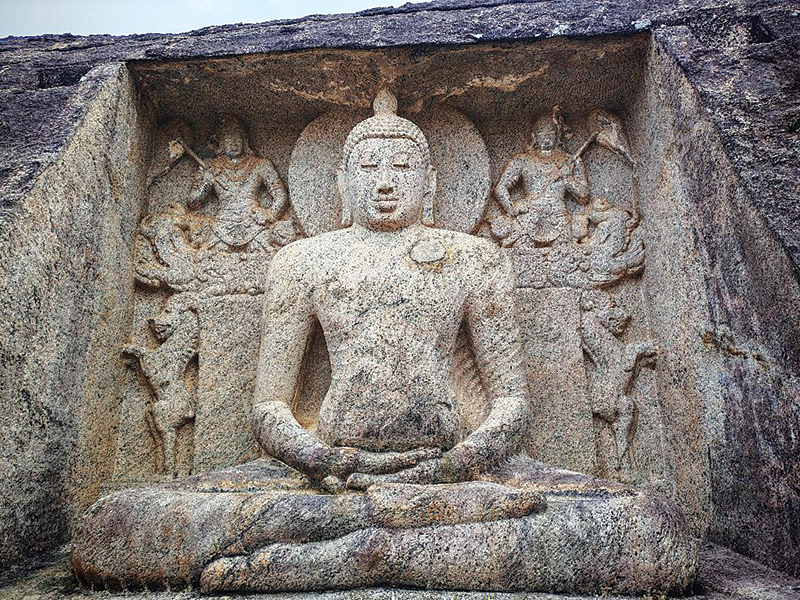 Among the most striking monuments at the site is the unfinished Samadhi Buddha statue, carved directly from a massive cube-shaped rock.
