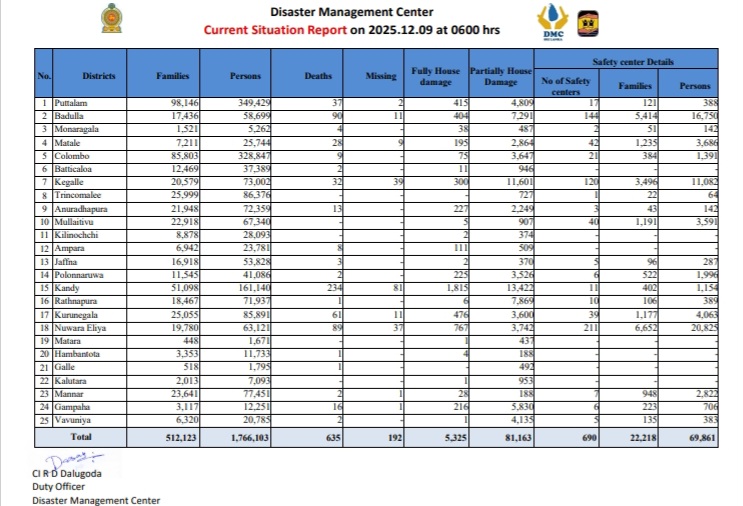 The Situation Report issued by the Disaster Management Center at 06:00 AM today [09th December] confirms that 635 persons have died due to floods and landslides that took place in the country within the past two weeks. The number of persons that are missing is 192.