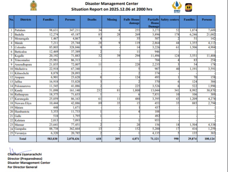 The Situation Report issued by the Disaster Management Center [DMC] at 2000hrs on Saturday [06] confirms that 607 persons have died due to the recent flooding and landslides while another 209 persons were missing.
