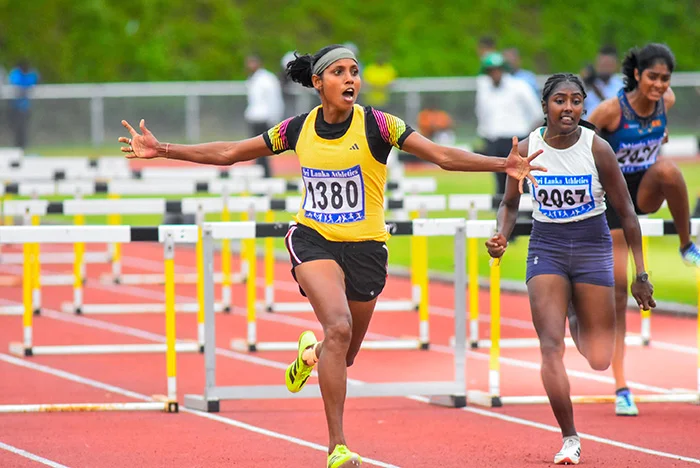 Lakshika Sugandi wins the 100m hurdles.