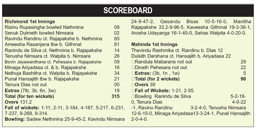 Deneth’s patient knock of 106 off 161 balls, which included 12 fours and two sixes, proved crucial in holding the innings together as Sri Dharmaloka were eventually bowled out for 211 in 76.3 overs.