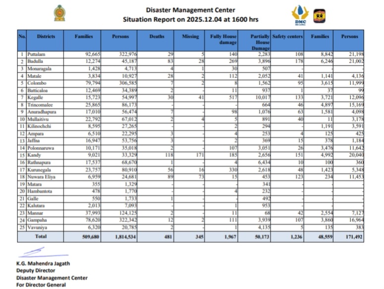 The Situation Report issued by the Disaster Management Centre at 1600 hrs today (04) confirms that 481 persons have died and another 345 persons are missing as a result of the adverse weather conditions that devastated the country.