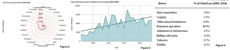 In contrast, the most densely populated urban districts, such as Colombo and Gampaha, show minimal tree cover loss. This is not because of successful conservation, but because these areas underwent extensive deforestation in the past, leaving very little forest to be cleared today. The modern frontier of deforestation has decisively shifted to the nation’s rural and developing districts.