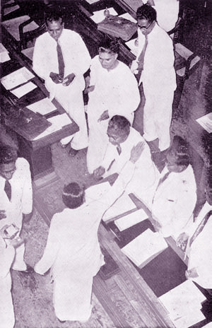 Newly-elected Prime Minister S.W.R.D. Bandaranaike crossing the floor of the House of Representatives to greet John Kotelawala