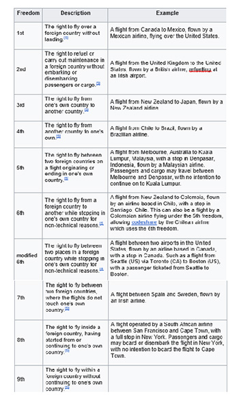 “The freedoms of the air, also called five freedoms of air transport, are a set of commercial aviation rights granting a country’s airlines the privilege to enter and land in another country’s airspace. They were formulated as a result of disagreements over the extent of aviation liberalisation in the Convention on International Civil Aviation of 1944, known as the Chicago Convention.[1] The United States had called for a standardized set of separate air rights to be negotiated between states, but most other countries were concerned that the size of the U.S. airlines would dominate air travel if there were not strict rules. The freedoms of the air are the fundamental building blocks of the international commercial aviation route network. The use of the terms “freedom” and “right” confers entitlement to operate international air services only within the scope of the multilateral and bilateral treaties (air services agreements) that allow them.