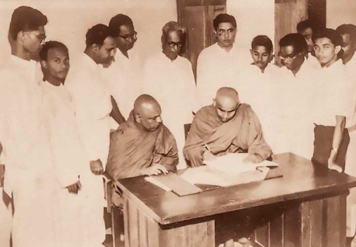 Photo – Bauddha Jatika Balavegaya – Opening of the Headquarters, Galle Road, Kollupitiya, Colombo 03 Date: 4th June, 1963 Picture Seated (left to right) Ven. Baddegama Wimalawansa Nayake Thero and Ven. Madihe Pannasiha Nayake Thero. Standing (left to right) Mr. Wijayananda de Abrew (first from left), Mr. Ronnie de Mel (Treasurer,BJB( 4th from left), L.H. Mettananda (President, BJB)(fifth from left), Nissanka Wijayaratne (Vice – President, BJB) (sixth from left) and Gunaseela Vithanage (Hony. Secretary, BJB) (bespectacled dark complexioned – eighth from left) http://www.lhmettananda.com/gallery-2/