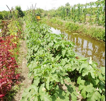 Introducing raised bed agriculture in unutilised paddy lands bordering roads using Sojan System. While growing vegetables on raised beds, aquatic plants such as Pan, Cane, etc., while introducing inland fishery. Aquatic plants could be used for weaving mats, knit bags, etc. thereby promoting use of ecofriendly products instead of using polythene and plastics. (See Fig 03)