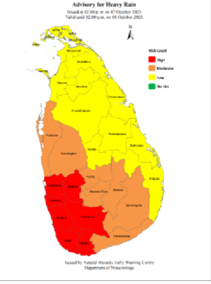 The Natural Hazards Early Warning Centre of the Department of Meteorology has issued an Advisory for Heavy rain for the Western, Sabaragamuwa and Southern provinces. The advisory was issued at 02.00 p.m. today (07) and will be valid until 02.00 p.m. tomorrow (08 October 2023).