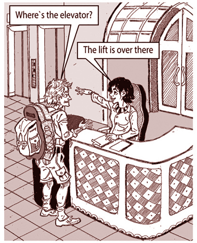 The place is a tourist hotel in the South. An American tourist asks the receptionist, “Where’s the elevator?” After some hesitation, the receptionist replies, “Sir, the lift is over there.” It is not clear whether she knew that ‘elevator’ is the American word for ‘lift’ in British English. Anyway, there was no misunderstanding. Many tourist hotels and private hospitals prefer the word elevator to lift. Maybe the American word is more fashionable than the British English word lift.