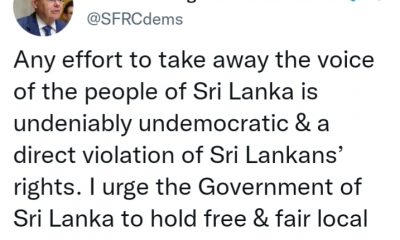 In a twitter message the US Senate Foreign Relations Committee aired its concerns on the postponement of the Local Authorities poll in Sri Lanka. The twitter...
