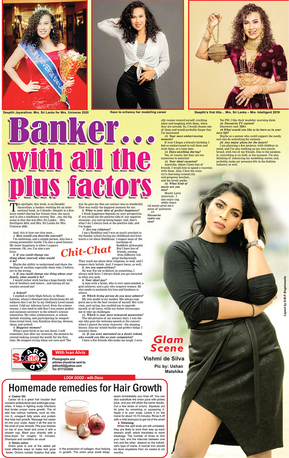 The spotlight, this week, is on Deepthi Jayarathne, a banker, working for an international bank, in Colombo. Deepthi is a freelance model (during her leisure time, she says), and is also a teledrama actress. But…yes, the big scene is that she was Mrs. Sri Lanka – Mrs. Intelligent 2019, and Mrs. Sri Lanka for Mrs. Universe 2020.