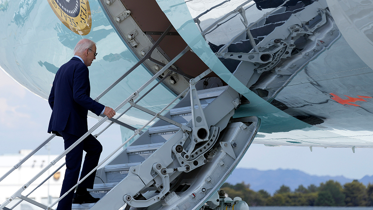 Mr Biden moved slowly and cautiously up the steps to the plane, video shows. He was not wearing a mask.