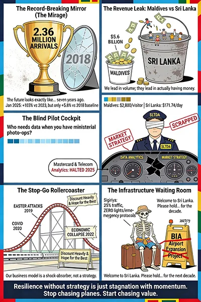 If policymakers continue to mistake arrivals for achievement, Sri Lanka will remain trapped in a cycle: crash, discount, recover, repeat. Meanwhile, competitors will consolidate high-yield models, and we will wonder why our tourism “boom” generates less cash, less jobs, and less development than it should.