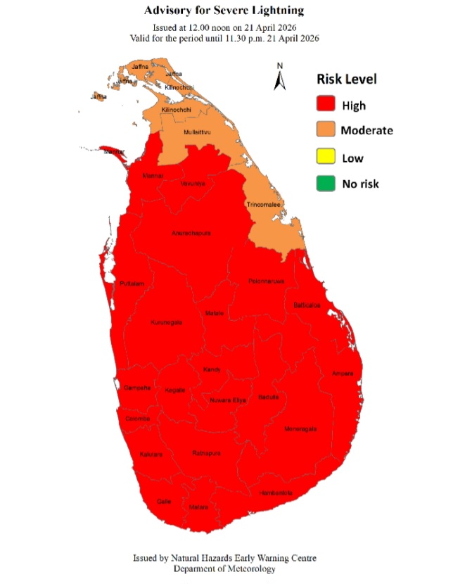 Thundershowers accompanied with severe lightning are likely to occur in the Western, Sabaragamuwa, Central, North-western, Northcentral, Southern, Uva provinces, and in Mannar, Vavuniya, Ampara, Batticaloa districts after 1.00 p.m.