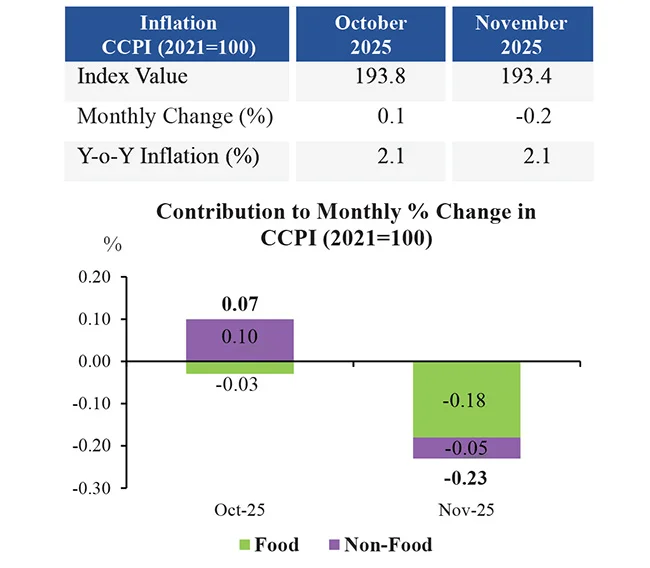 The Colombo Consumer Price Index (CCPI, 2021=100)1 based headline inflation (year-on-year, Y-o-Y) remained unchanged at 2.1% in November 2025, compared with the previous month.