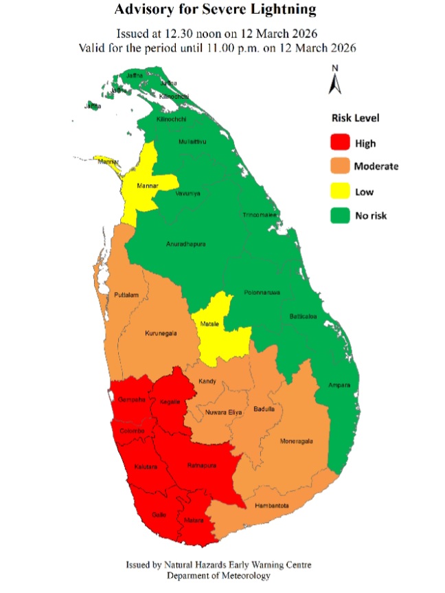 Advisory for Severe Lightning Issued by the Natural Hazards Early Warning Centre at 12.30 noon 12 March 2026 valid for the period until 11.00 p.m. 12 March 2026