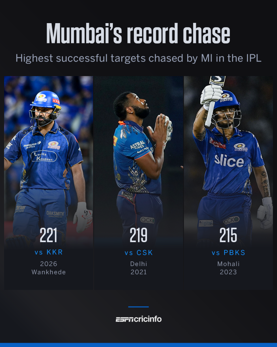 Before Sunday, Mumbai Indians had never chased down a 220-plus target in their previous seven attempts. MI had never won their opening game of the IPL since 2012. On day two of IPL 2026, MI broke two jinxes as they chased down 221 in 19.1 overs to begin their season with a comfortable six-wicket win over Kolkata Knight Riders. Rohit Sharma wound back the clock, smashing 78 off 38 balls, while Ryan Rickelton thumped 81 off 43, the duo adding 148 runs for the opening wicket off 71 balls.