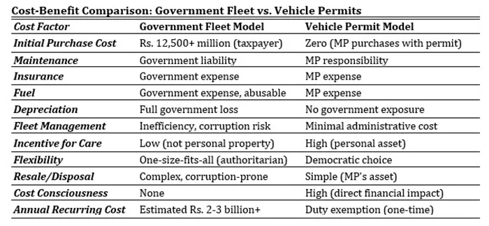 The numbers tell an unambiguous story. Under the permit system, the government bore only the cost of duty exemption, essentially foregone revenue on vehicles MPs would purchase anyway. Under the new fleet system also the government still have to bear the cost of duty exemption, in addition, taxpayers fund not just the purchase but every aspect of ownership: maintenance, insurance, fuel, depreciation, and bureaucratic overhead. This is fiscal masochism dressed as reform.