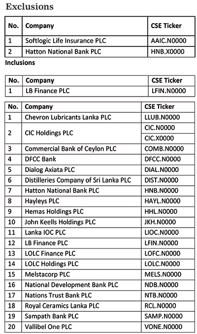 Effective from 24th June 2024 the stocks in the S&P Sri Lanka 20 in alphabetical order are as given.