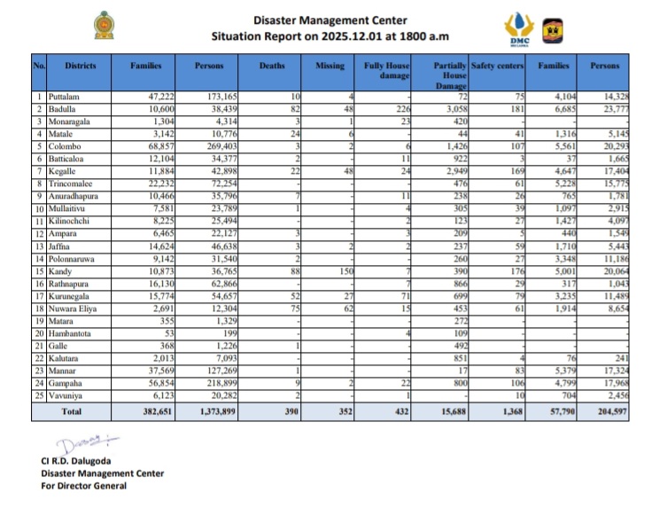 The Situation Report issued by the Disaster Management Centre (DMC) at 1800 hrs today (01st December) confirms that 390 persons have died and another 352 persons are missing as a result of the adverse weather conditions.
