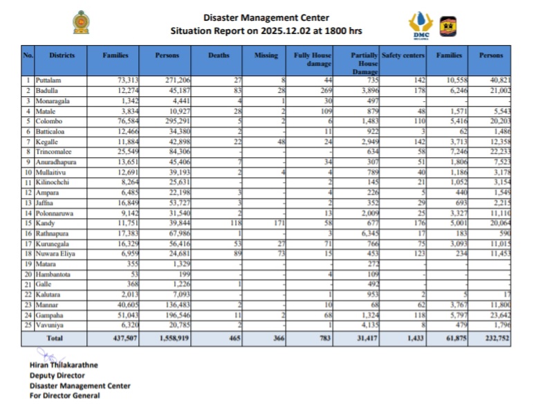 The Situation Report issued by the Disaster Management Center (DMC) at 1800hrs today (2nd December) confirms that 465 persons have died and another 366 persons are missing as a result of the adverse weather conditions that ravaged the nation.