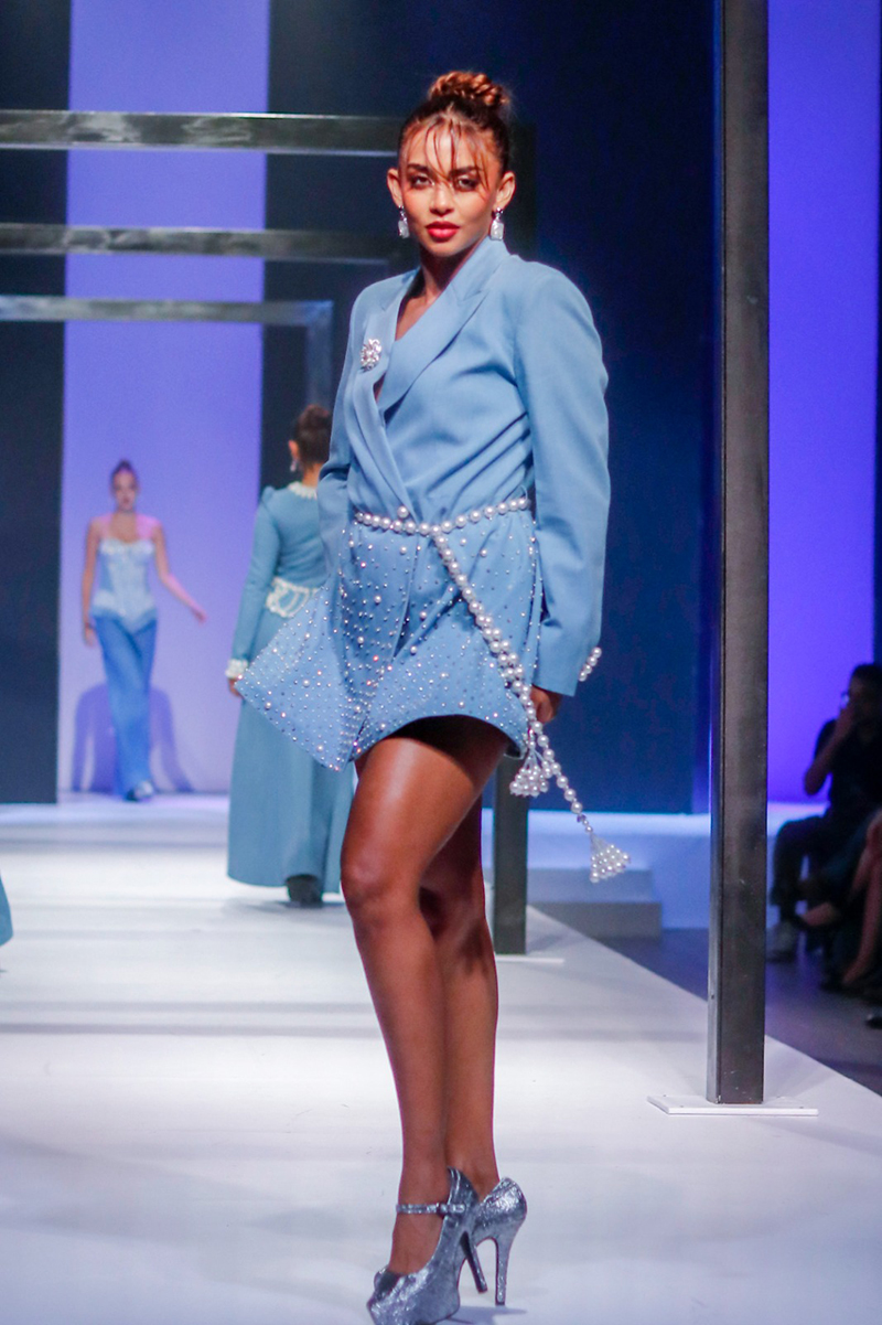 Aslam brought denim out of its everyday comfort zone into the world of glamour redifining what casual luxury can look like on a runway. Sharply tailored denim jackets, paired with flowing silhouettes, pearls, embellished jeans that layered textures that balanced rugged fabrics with high fashion detailing, corset inspired denim tops, oversized statement coats, showed, how versatile the fabric can be when handled with imagination.