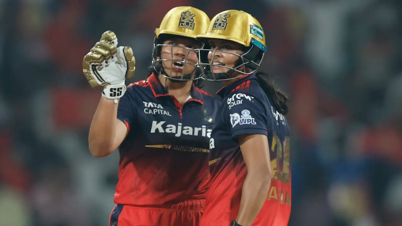 Kashvee Gautam was the first to strike with an inswinger pinning Harris lbw. In her next over, debutant Shivani Singh plucked a one-handed catch at short fine leg to dismiss Dayalan Hemalatha. Renuka made amends on return by having Smriti Mandhana slice a catch to short third. Devine had Gautami Naik plumb in front in the sixth over as RCB slipped to 43 for 4.