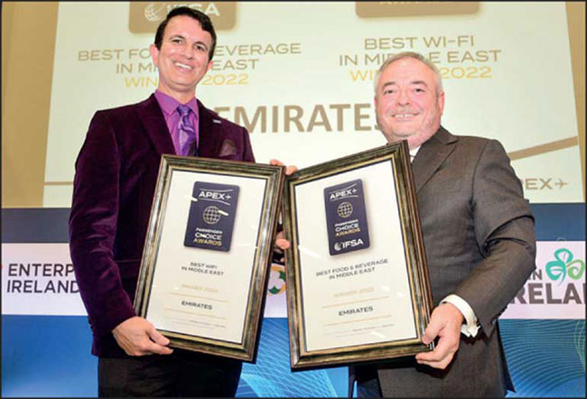 Travellers around the world have recognised Emirates for Best Wi-Fi and Best Food & Beverage in the Middle East, with the airline bagging these awards at the prestigious 2022 APEX Regional Passenger Choice Awards ceremony held in Dublin, Ireland.
