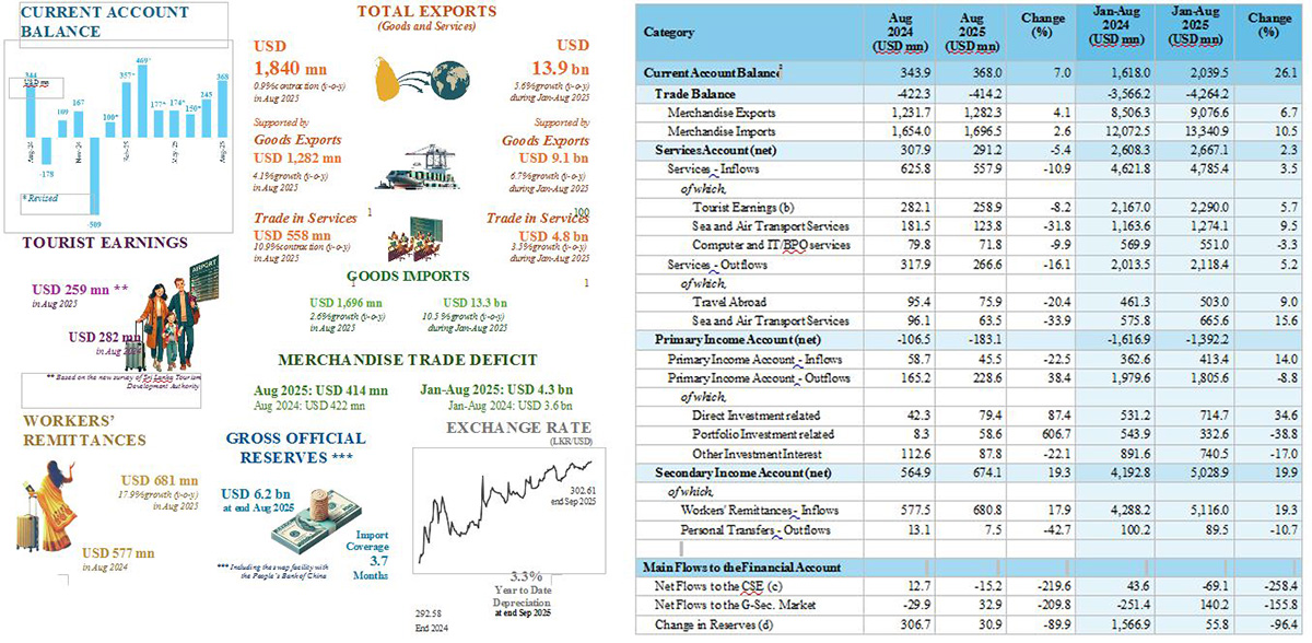 - Sri Lanka’s external sector continued to strengthen in August 2025, as the current account maintained its streak of monthly surpluses.