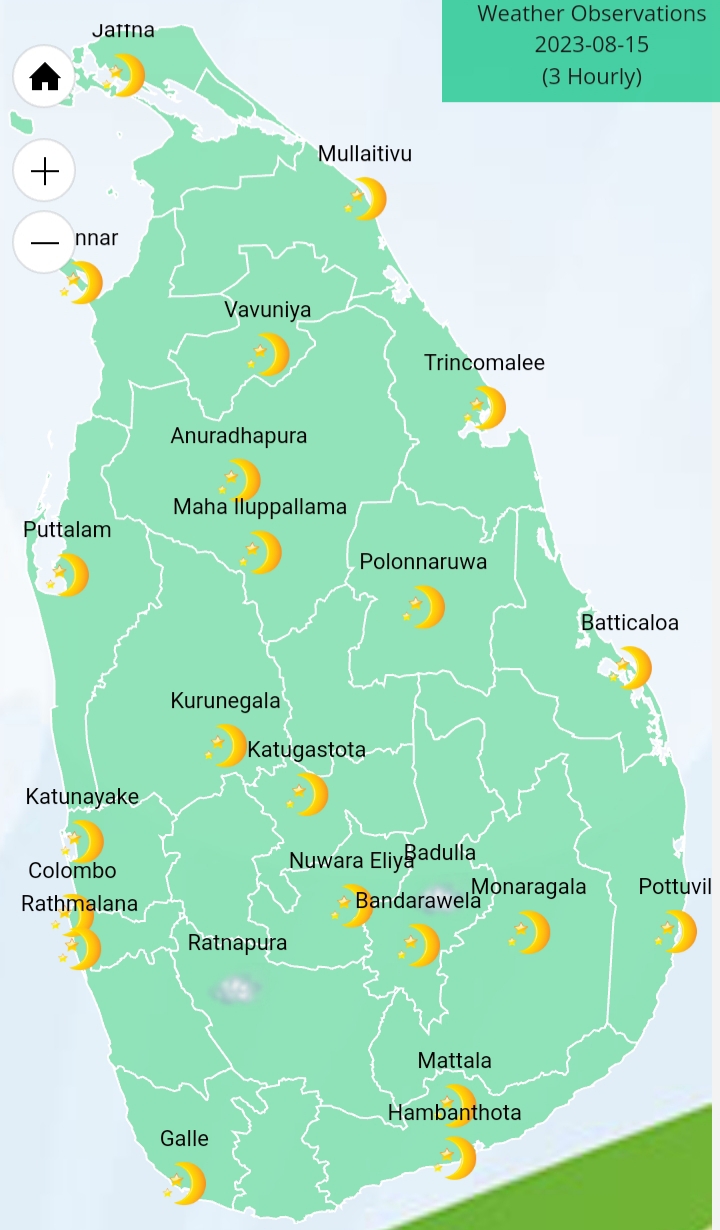 Showers will occur at times in the Eastern and Uva provinces and in Nuwara-Eliya, Matale, Polonnaruwa, and Mullaittivu districts. Fairly heavy showers above 50 mm are likely at some places in the Eastern province and in Nuwara-Eliya, Matale, Badulla, Polonnaruwa, and Mullaittivu districts.