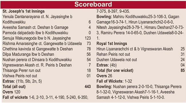 Royal’s bowlers toiled hard, with Mahiru Kodithuwakku and Himaru Deshan leading the effort with three wickets apiece, but the Josephians eventually posted an imposing 443 all out in 120 overs.