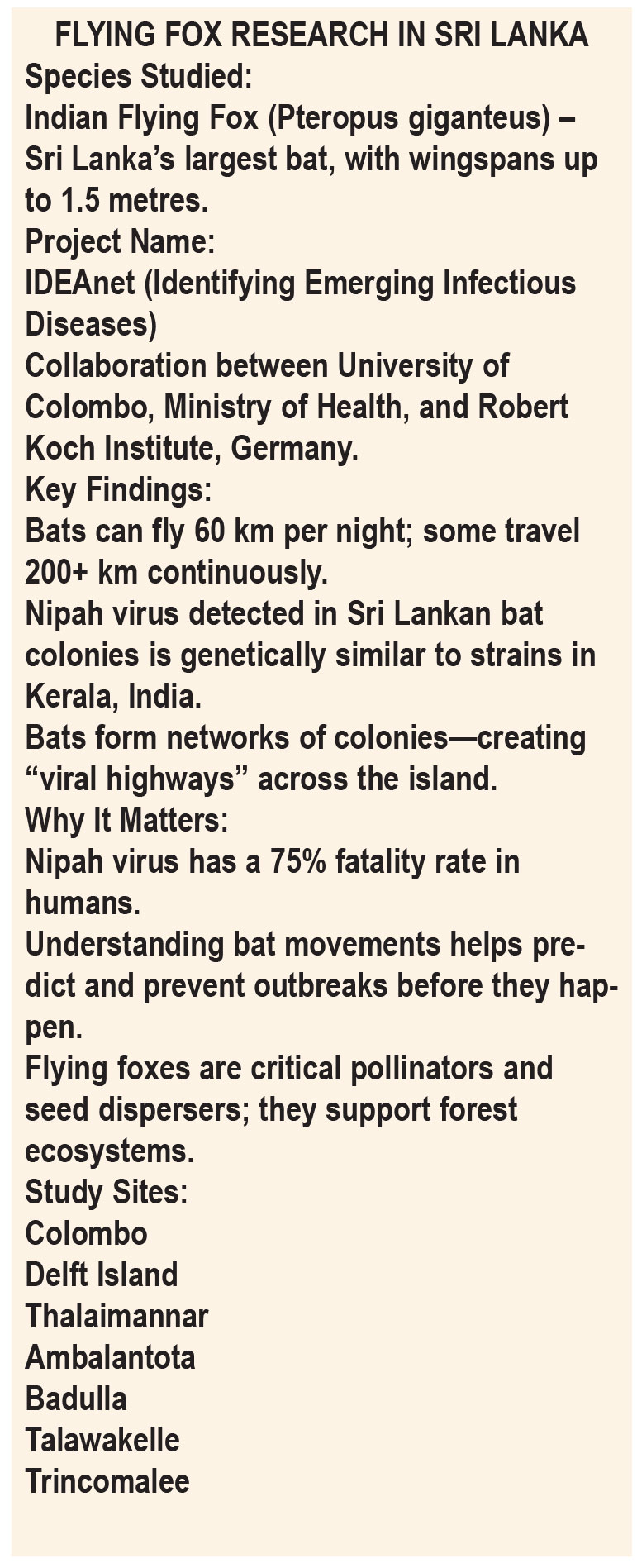 As dusk settles again over Sri Lanka, flying foxes take off in silent waves, gliding above towns and fields. To some, they remain enigmatic symbols of mystery and fear. But to scientists, these bats are keys to solving one of the 21st century’s greatest challenges: how to coexist with nature in a world of growing health risks.