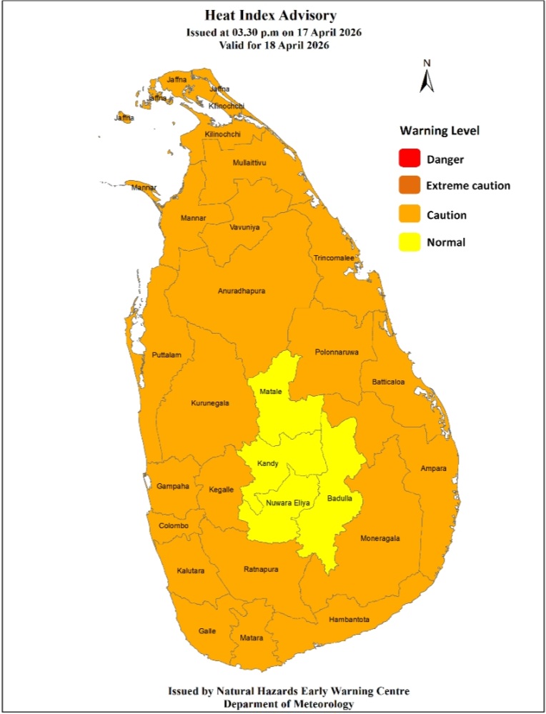 Heat Index at Caution Level in the Northern, North-central, North-western, Western, Sabaragamuwa, Eastern and Southern provinces and in Monaragala district