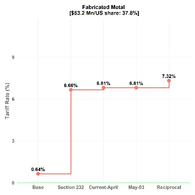 Lack of information on the steel and aluminium content makes reporting challenging for exporters. Although tariff calculations need the aluminium or steel value, that information is not given in publicly available data; the calculation of tariff increases needs assumptions. Assuming 25% of product value, the fabricated metal sector sees a weighted average tariff increasing to 6.7% from the base tariff rate of 0.6%. The Section 232 products are not subject to reciprocal tariffs. It explains the stable weighted average tariff rate for the fabricated metal sector, even after applying a 10% global tariff and 44% reciprocal tariffs in Figure 2.