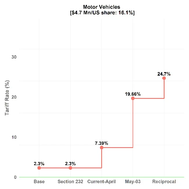 The US also announced tariffs on automobiles and parts on March 26 and enacted auto tariffs on April 03. However, the tariffs on automobile parts were delayed to a future date not later than May 03, 2025. The auto components account for 0.5% or USD 10.9 Mn exports by Sri Lanka. New pneumatic radial tyres, non-cellular vulcanised rubber articles, and electric control apparatus are among the products subject to auto component tariffs. As shown in Figure 2, the effective weighted average tariff for motor vehicle sector exports from Sri Lanka to the US will increase to 19.66% on May 03.