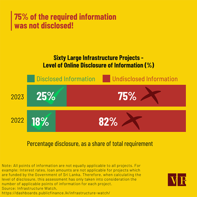 Despite the Right to Information (RTI) Act’s proactive disclosure requirement, only 18% and 25% of information required to be disclosed on large-scale infrastructure projects was proactively disclosed online in 2022 and 2023 respectively, according to Verité Research.