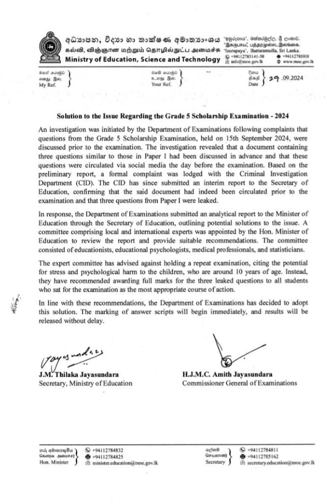 The Secretary to the Ministry of Education and the Commissioner General of Examinations have announced that as investigations have revealed that three questions similar to those in paper 1 of the grade 5 scholarship examination had been discussed and circulated via social media the day prior to the exam, it has been decided to award full marks for the said three questions to all candidates who sat the 2024 Grade 5 Scholarship Examination.