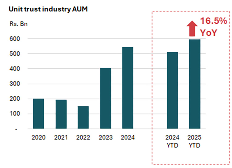 The unit trust industry of Sri Lanka reported a 16.5% year-over-year growth of its assets under management (AUM) to Rs. 597 Bn by the end of November 2025. These assets are currently managed across 85 funds by 16 management companies.