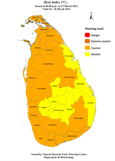 Heat Index advisory issued by the Natural Hazards Early Warning Centre At 4.00 p.m. 29 March 2024, valid for 30 March 2024