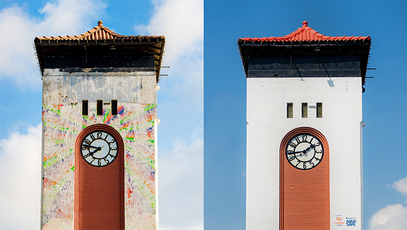 The restoration of the clock tower began as painters cleaned and repainted the structure, which was in a state of decaying paint. The event was attended by representatives from the Panadura Municipal Council, the Panadura community, local merchants, and officials from Asian Paints Causeway. The clock tower was repainted with SmartCare AquaSafe, a leading exterior paint known for its durability against algae, dirt, and peeling, restoring the tower’s former charm.