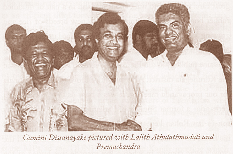 There were many business people who made voluntary contributions and we were able to finance our public meetings with such “ad hoc’ support. Since I was on good terms with both leaders I could smoothen out some problems which were created by tale carriers. For instance Lalith held a meeting in the Kalutara Town Hall and a tale carrier who wanted to be the organizer rushed to Gamini alleging that Lalith had criticised him. Fortunately I happened to be at that meeting and could inform Gamini that no such thing happened.