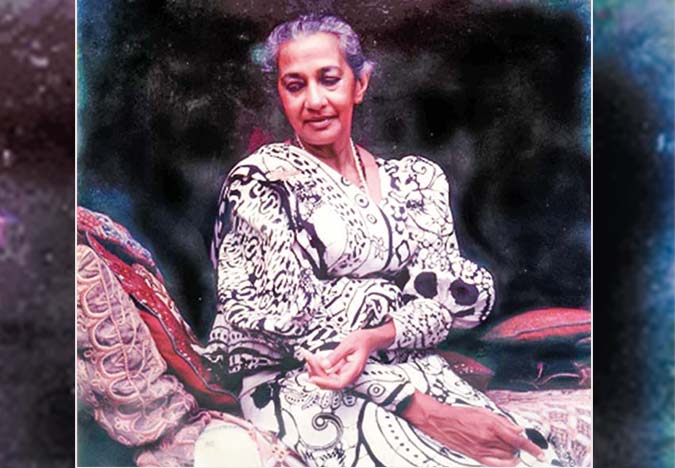 “Ena embodies in her personality and her work what is now often called ‘feminine power’. She was called ‘Lady of the Banners’ after her creations were hugely hung in hotels like the Oberoi Colombo, Bentota Beach Hotel and Mahaveli Reach Kandy. She first came into prominence – a very beautiful young woman – as Queen of Lanka in Arthur Van Langenberg’s Independence Day celebratory Pageant of Lanka in 1950. Photographs of her appeared often in the social pages of the daily press.