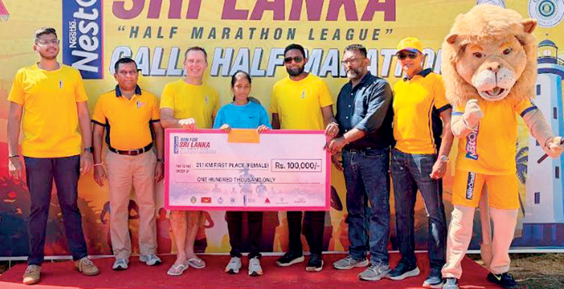 Rashmi Chathurangani, the winner of the women’s 21km race of the Nestomalt Run for Sri Lanka with her award