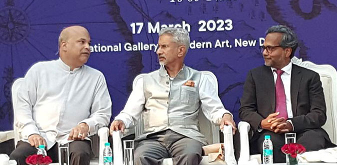 From left: Sri Lankan High Commissioner in India, Milinda Moragoda, Indian External Affairs Minister Dr. S. Jaishankar and Sanjay Kulatunga, Trustee, Geoffrey Bawa Trust, at the launch of Geoffrey Bawa: It's Essential to be There – Exhibition at the National Gallery of Modern Art, New Delhi, on 17th March 2023