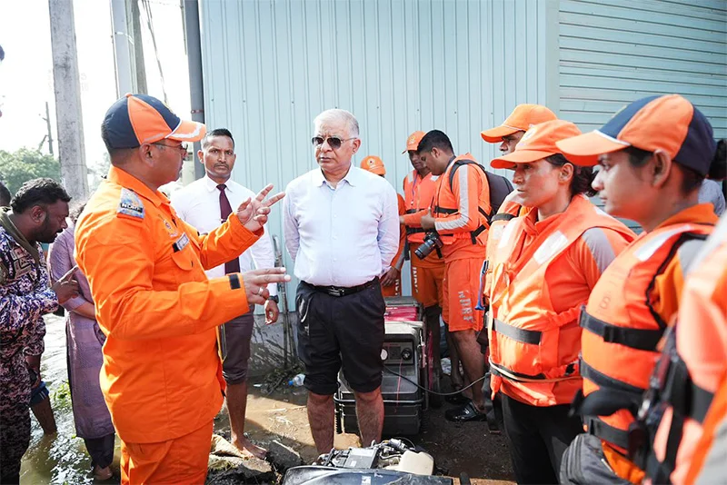 High Commissioner of India to Sri Lanka Santosh Jha visited Sedawatta near Colombo on Tuesday (02) to review ongoing NDRF rescue operations. The High Commissioner also interacted with affected residents and local authorities coordinating the ground response. At this site, NDRF teams are conducting meticulous door-to-door evacuations and distributing essential relief in heavily inundated areas around Nadeegama on the banks of the Kelani River, where floodwaters have risen up to six to eight feet. 52 persons were evacuated from here yesterday. NDRF team in Badulla continues search operations in landfall areas. One deceased person was recovered after complex excavation operations, yesterday.