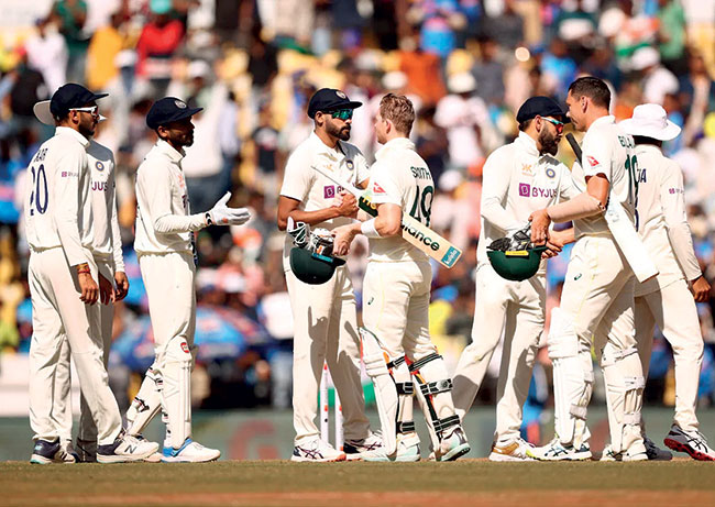 Australia 1st Innings 177 all out (Marnus Labuschagne 49, Alex Carey 36, Steven Smith 37; Ravindra Jadeja 5/47) and 91 all out (Steven Smith 25 n.o.; Ravichandran Ashwin 5/37)