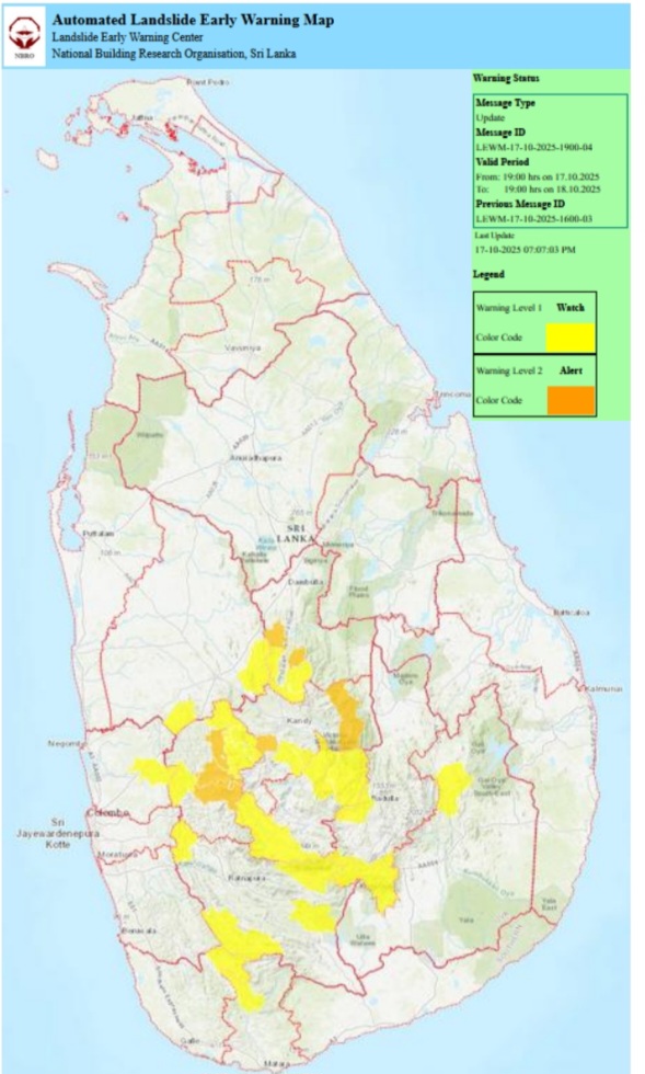 The Landslide Early Warning Center of the National Building Research Organization [NBRO] has issued landslide early warnings to the districts of Badulla, Galle, Gampaha, Kandy, Kegalle, Kurunegala, Matara, Mathale, Monaragala, Nuwara Eliya and Ratnapura.The warnings issued at 1900 hrs today will be effective for the next 24 hours