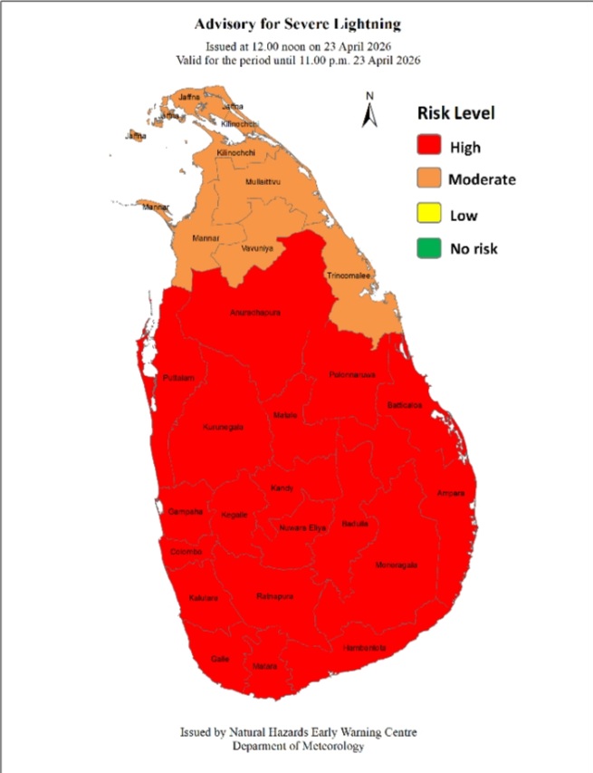 Advisory for Severe Lightning issued for the Western, Sabaragamuwa, Central, North-western, North-central, Southern, Uva provinces, and Ampara and Batticaloa districts